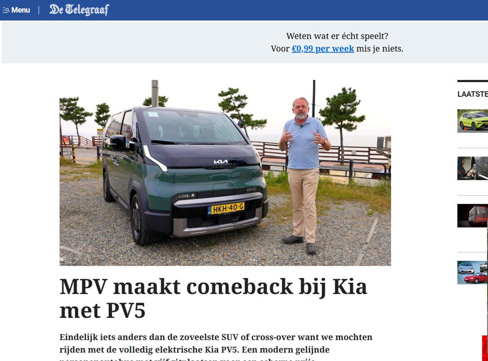 Pontificaal bovenaan het artikel op Telegraaf.nl staat een foto van een groene Kia PV5 met daarnaast Autovisie hoofdredacteur Jaco Bijlsma. En op de Kia zit een Nederlands kenteken HKH-40-G.