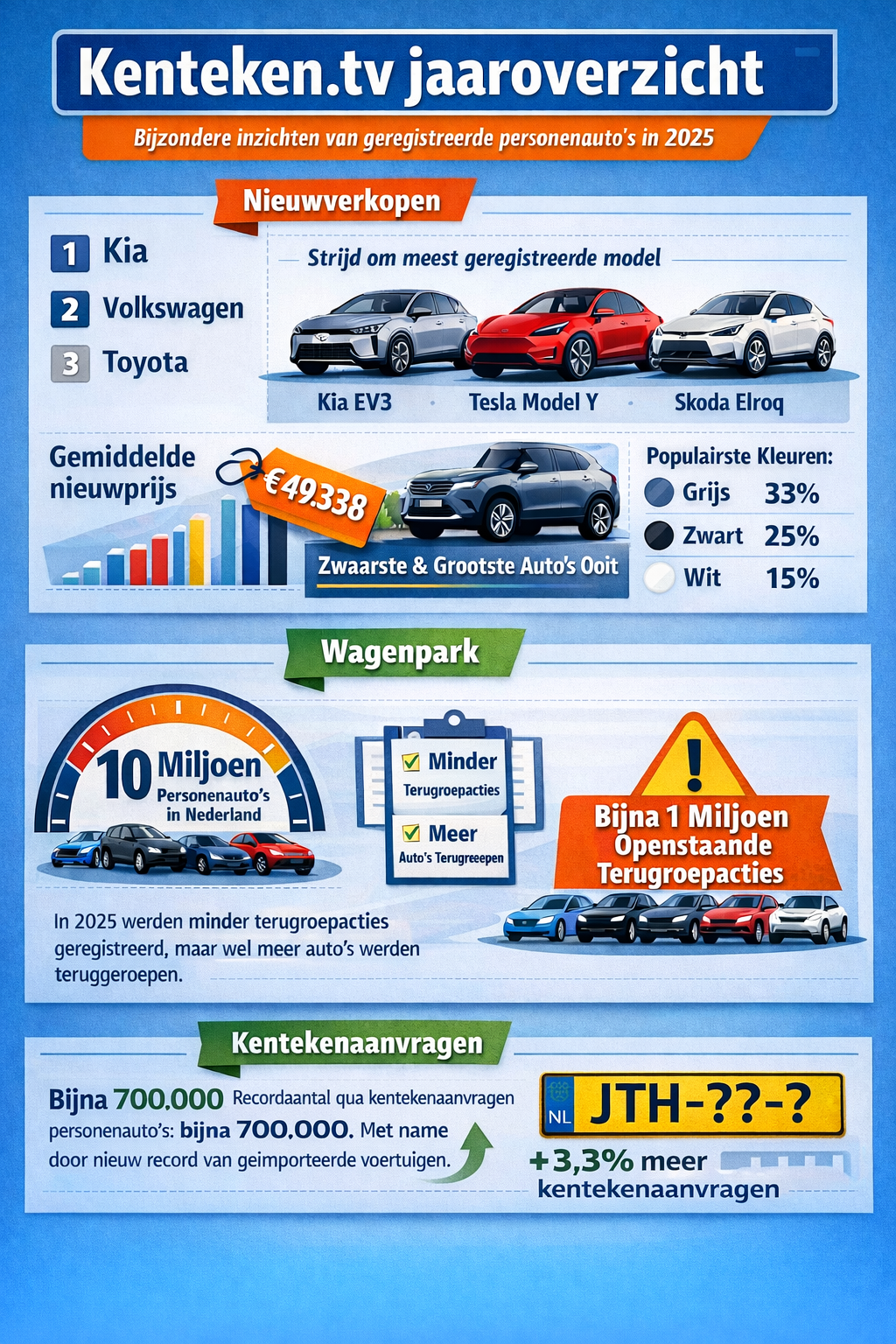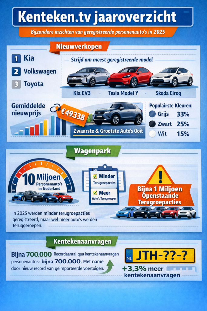 Kentekenjaar 2025 heeft weer diverse nieuwe records opgeleverd. In het Kenteken.tv jaaroverzicht wordt dit verder toegelicht. Zo werd dit jaar de tien miljoenste personenauto geregistreerd en de nieuwste toevoegingen aan het wagenpark vielen vooral op qua afmetingen, gewicht en nieuwprijs. En niet zozeer qua kleurstelling.