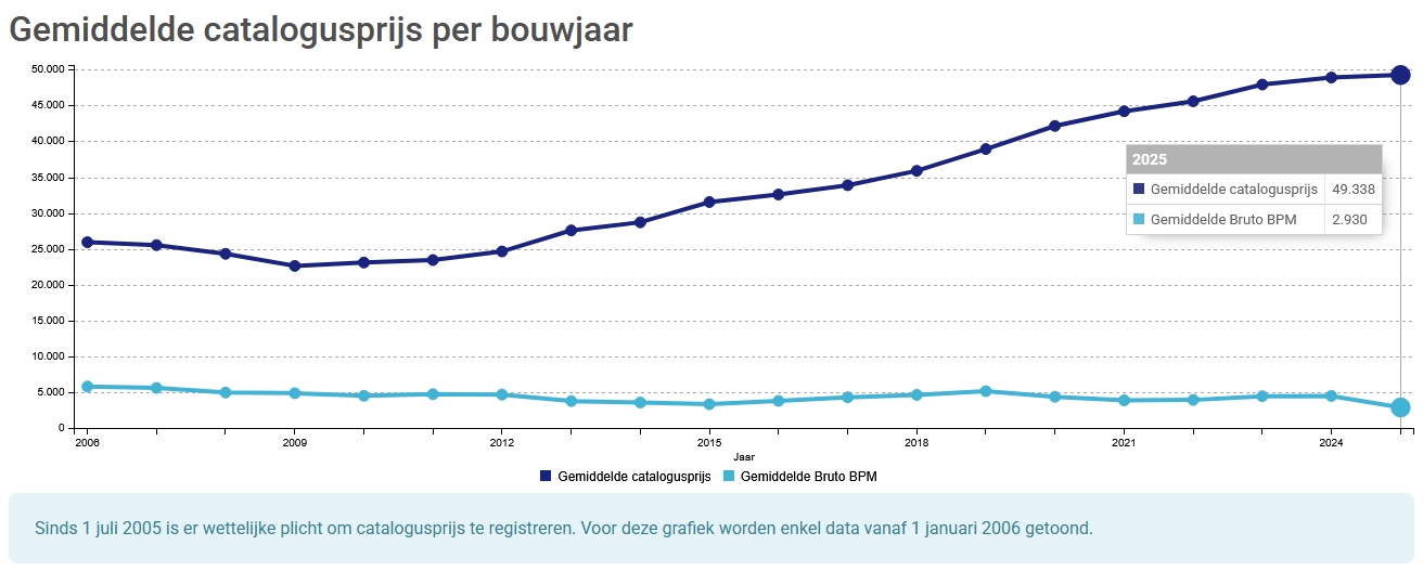 Op basis van de huidig geregistreerde personenauto’s in het Nederlands kentekenregister staat 2025 qua gemiddelde catalogusprijs bovenaan. De grens van 50.000 euro is nog net niet gepasseerd: