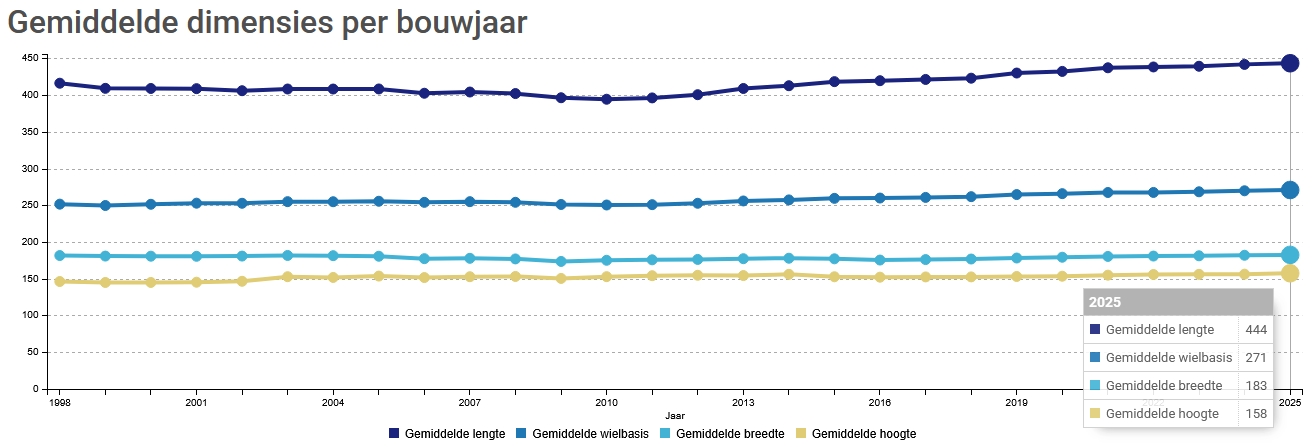 Terwijl de lijnen voor lengte en wielbasis langzaam oplopen, zijn de gemiddeldes voor breedte en hoogte redelijk constant gebleven.