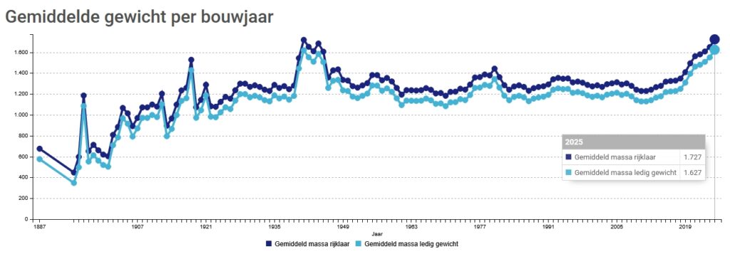 Van het huidig wagenpark zijn de auto’s uit 2025 gemiddeld gezien het zwaarst. Vanwege het gebruik van gemiddeldes waren de beperkt aantal geregistreerde auto uit de oorlogsjaren 1940-1945 jarenlang de zwaarste. Deze voornamelijk militaire voertuigen zijn voorzien van allerlei zware bepantsering.