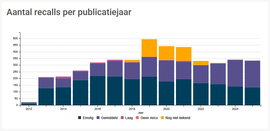 In 2025 zijn er in totaal minder terugroepacties geregistreerd. Het waren er 334 in totaal en dat is net iets minder dan 341 terugroepacties geregistreerd in 2024.
