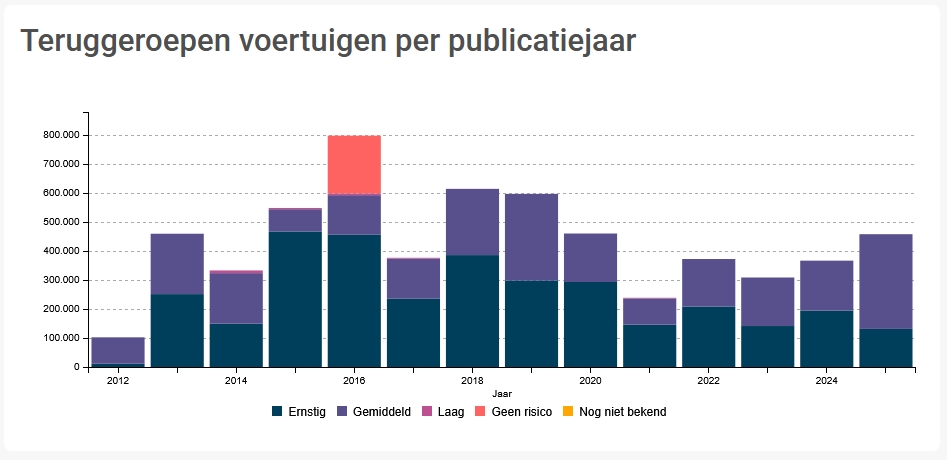 Ondanks de lichte daling werden er wel meer voertuigen teruggeroepen in vergelijking met 2024. Meer dan 458.000 voertuigen kregen een melding in het kentekenregister. In het RDW Terugroepregister wordt per recall ook het risico geregistreerd: laag, gemiddeld of ernstig. In 2025 werden vooral voertuigen met een risico beoordeling “gemiddeld” teruggeroepen, namelijk 326.096. Voor dit type risico is dat een nieuw record. Risicobeoordeling “ernstig” had juist een laagterecord met 132.794 voertuigen. In 2012 werden wel minder voertuigen met deze beoordeling genoteerd, maar dat was ook het opstartjaar van terugroepregister.