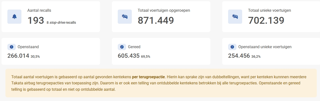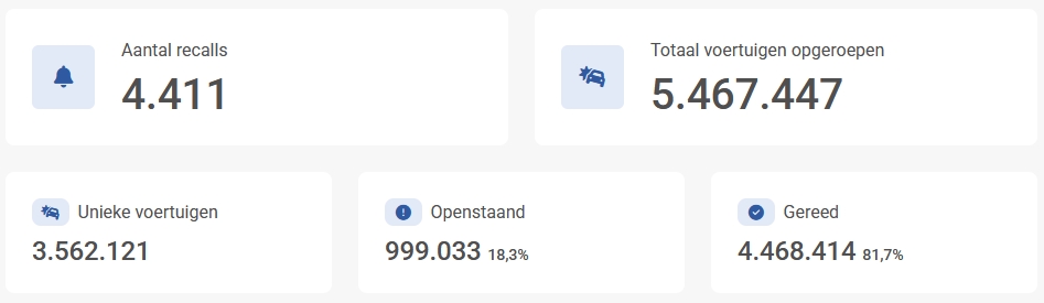 Het grote makke van het terugroepactiesysteem blijft echter de terugkoppeling van reparaties. Sinds 2012 zijn er meer dan 4.400 terugroepacties geregistreerd. Daarbij zijn er 5,4 miljoen oproepen geweest. Qua unieke voertuigen zijn/waren dat 3,5 miljoen voertuigen.