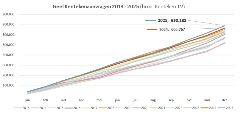 Als 2025 is afgerond zullen deze verhoudingen anders liggen. Zo zal het jaar rond 380.000 nieuwe voertuigen eindigen en qua import zal de teller boven 300.000 eindigen. De groei van import is harder dan de daling van nieuwe voertuigen. Dit heeft ook een effect op het aantal kentekenaanvragen. In 2025 zal namelijk een nieuw record worden gevestigd.
