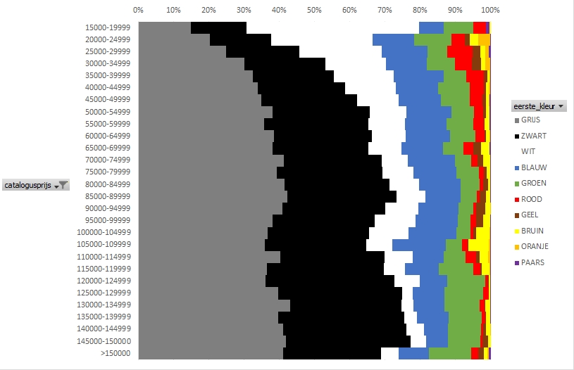 Een andere dwarsdoorsnede van de gegevensset is te maken op basis van de catalogusprijs. Al enkele jaren is de conclusie hetzelfde: hoe duurder, hoe kleurlozer.