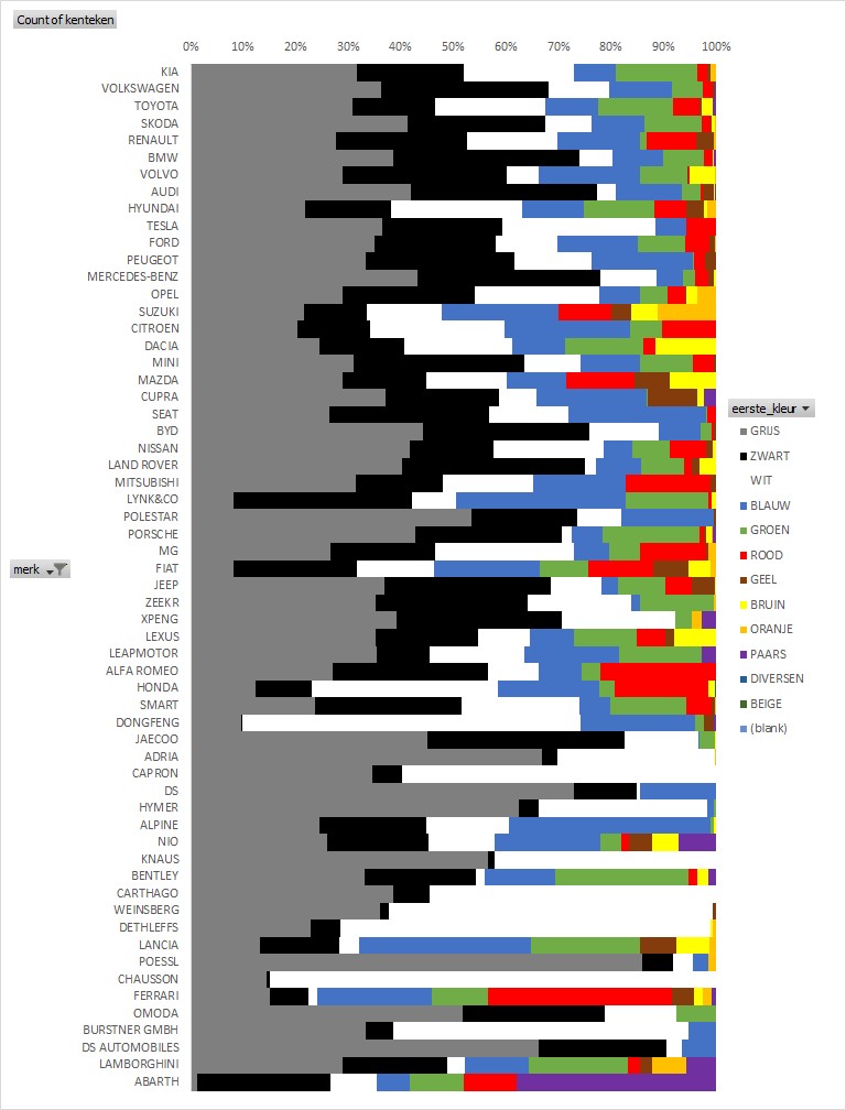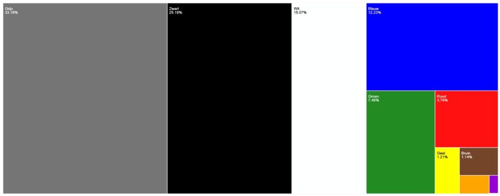 Het is ook mogelijk om de kleurverdelingen per merk voor de 60 grootste merken van 2025 in 1 grafiek te proppen. Dan krijg je een bijzondere grafiek dat veel weg heeft van een kleurrijk opgemaakte streepjescode: